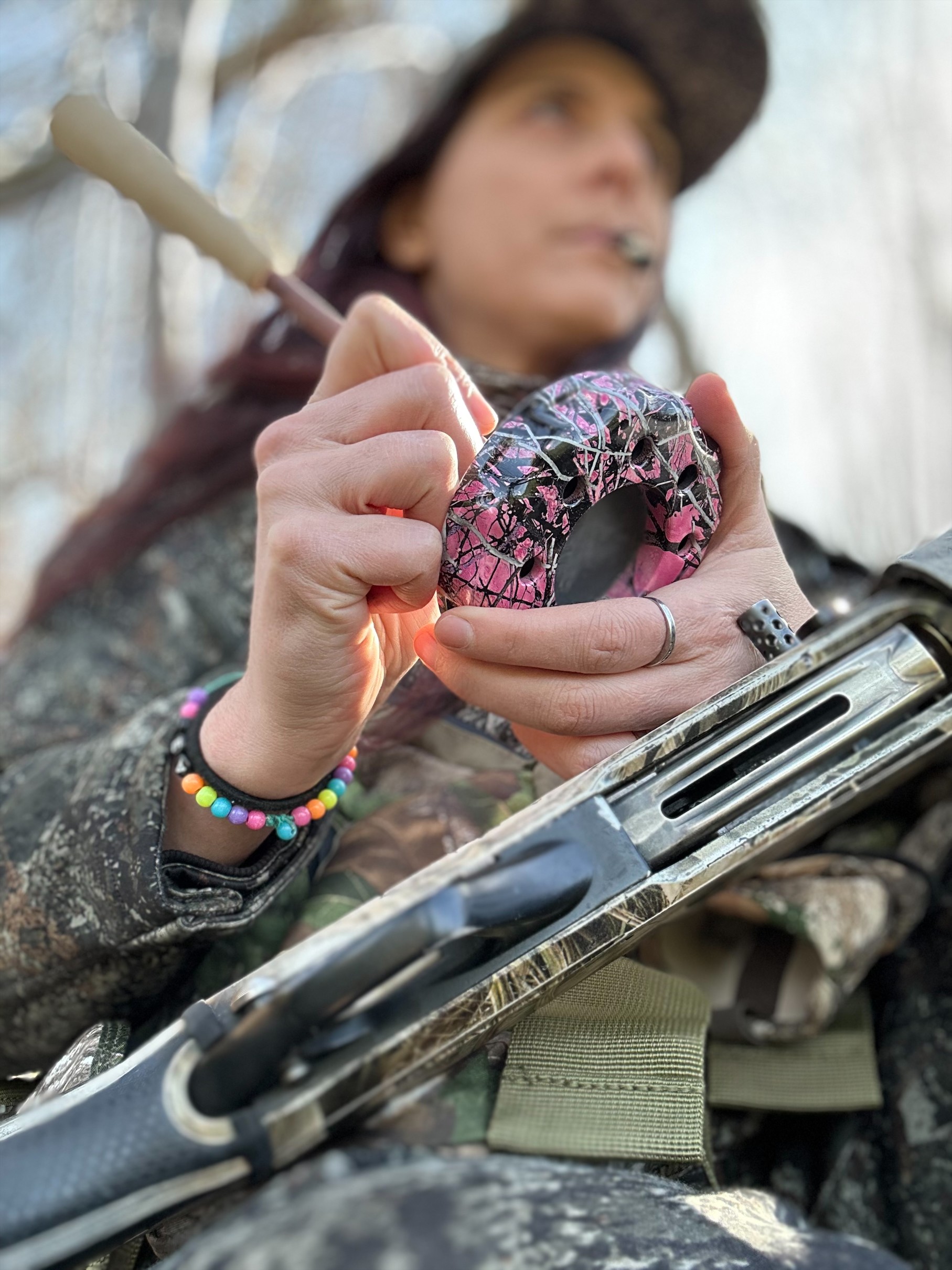 Jennifer Desrochers explique les types d’appeaux à dindon — friction, vent et localisateurs — et l’importance de diversifier les sons pour s’adapter à chaque situation de chasse.